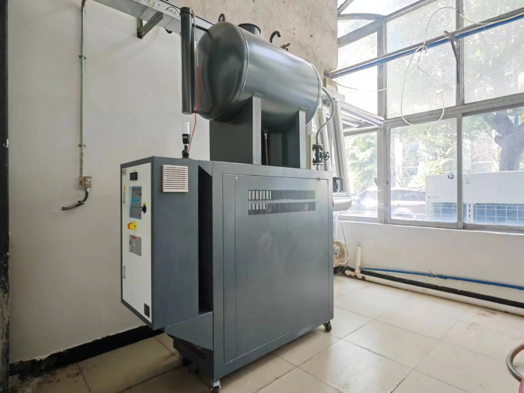 案例現場為廣州一家醫藥公司,電加熱油爐為客戶提供三個蒸餾釜加熱控溫使用。奧蘭特機械提供設備。設備安裝、管路維護包保溫棉。