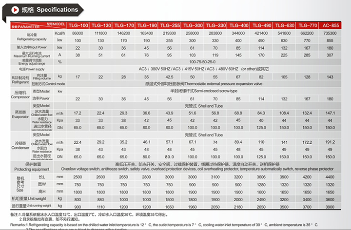 trolled ±2℃名義制冷量是依據冰水入口溫度12℃,出口溫度7℃,環境溫度35℃得出。