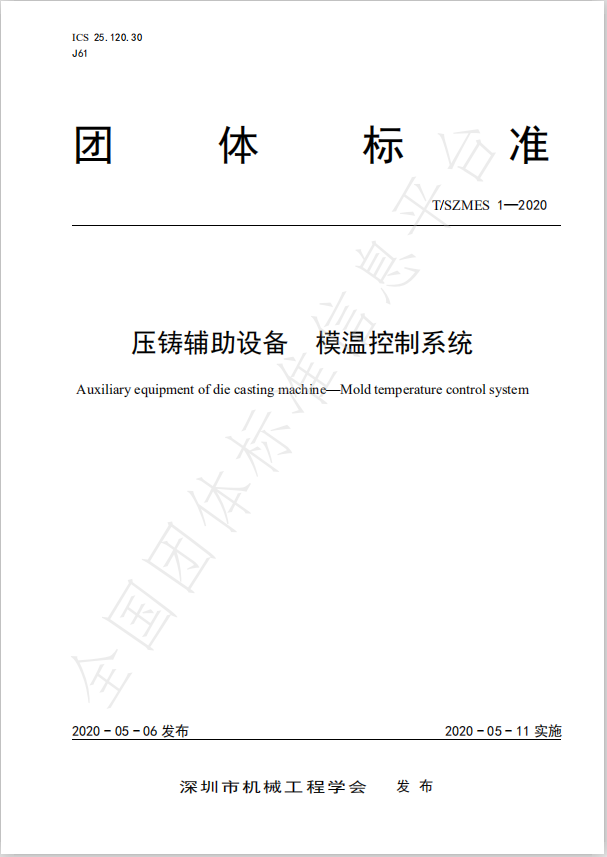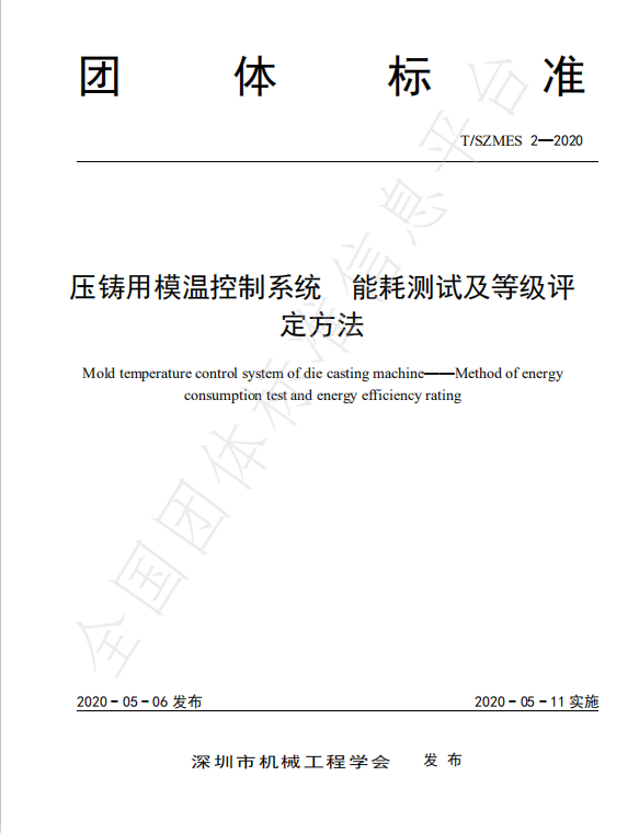 中國模溫機也有標準啦!由深圳市機械工程學會在全團體標準信息平臺2020年5月6日發布,2020年5月11日實施:壓鑄輔助設備 模溫控制系統(壓鑄模溫機)、壓鑄用模溫控制系統 能耗測試及等級評定方法的團體標準,本標準按照GB/T 1.1—2009給出的規則起草,由深圳市機械工程學會提出與歸口,起草單位蘇州奧德、深圳市奧蘭特機械、深圳大學、深圳市機械工程學會等十家相關企業天。壓鑄模溫機標準化的誕生,是模溫控制系統跨出了一小步,中國民企跨出了一大步。